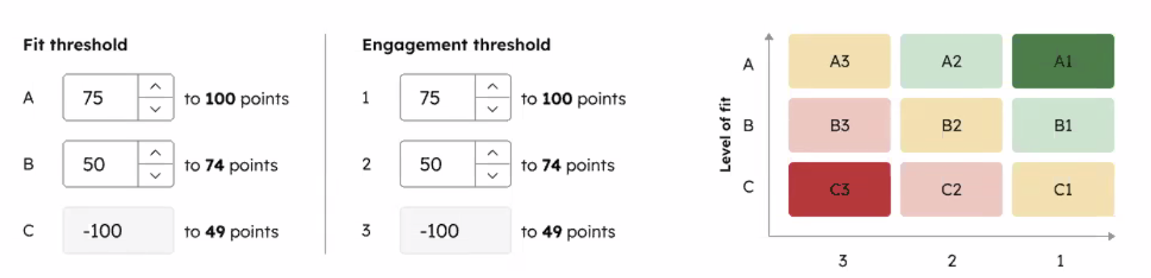 Step 1: Set your thresholds. Configure your fit and engagement thresholds in HubSpot's scoring settings. This is where you define what A, B, C and 1, 2, 3 mean for your business.